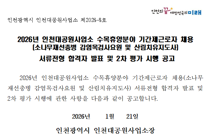 2026년 인천대공원사업소 수목휴양분야 기간제근로자 채용 서류전형 합격자 발표 및 2차 평가 시행 공고