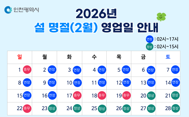 ○ 영업시간 연장 : 2026. 2. 2.(월)~2. 16.(월) / 일요일 영업 포함