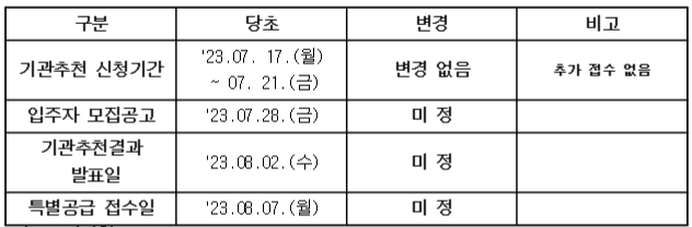 향후 공급일정 확정 시 입주자 모집공고일, 기관추천 결과 발표일 등 재안내 예정이오니 참고하시기 바랍니다.