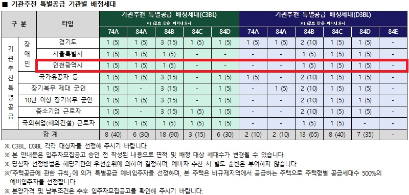 - 기관추천 특별공급 배정세대 수 및 접수 일정 등을 반드시 시행사 기관추천 특별공급 안내문에서 확인하시기 바랍니다.