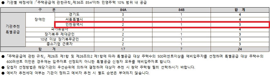 - 기관추천 특별공급 배정세대 수 및 접수 일정 등을 반드시 시행사 기관추천 특별공급 안내문에서 확인하시기 바랍니다.