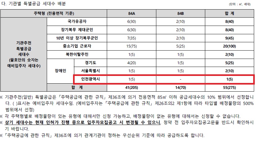 ※ 장애인 기관추천 특별공급 관련 개선사항(2022.1.3.시행) : 무주택 세대구성원 기간 및 인천시 연속 거주기간 등 자격요건 판단 기준일을