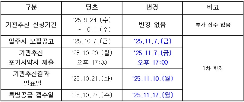 신청하신 분들께서는 추후 착오가 없도록 변경된 시행사의 기관추천 특별공급 안내문에서 공급 일정 등을