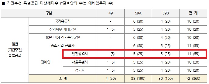 ※ 장애인 기관추천 특별공급 관련 개선사항(2022.1.3.시행) : 무주택 세대구성원 기간 및 인천시 연속 거주기간 등 자격요건 판단 기준일을