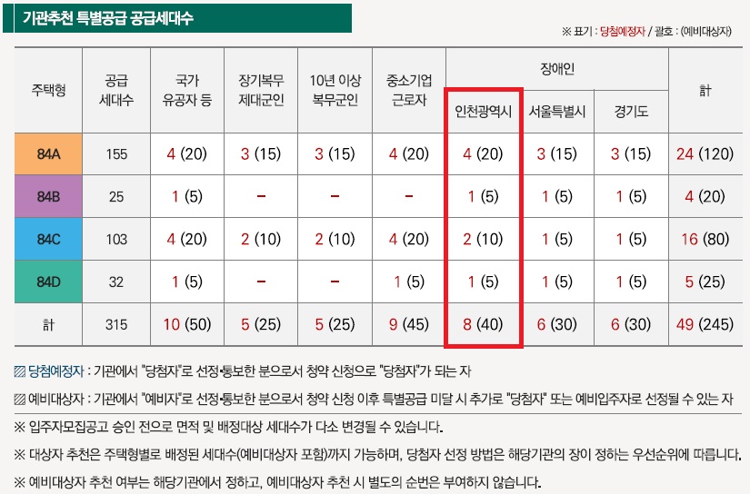 ※ 장애인 기관추천 특별공급 관련 개선사항(2022.1.3.시행) : 무주택 세대구성원 기간 및 인천시 연속 거주기간 등 자격요건 판단 기준일을
