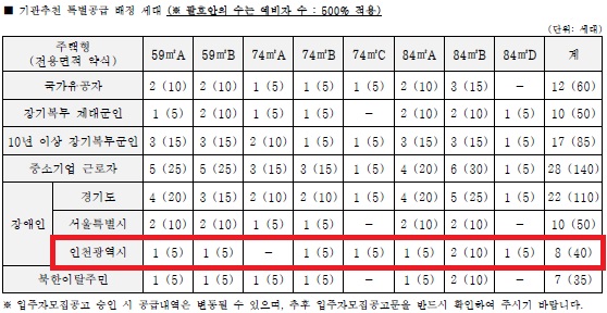 - 건설사의 사정으로 입주자 모집공고일이 최초 인천시 홈페이지에 안내한 입주자 모집공고(예정)일로부터 6개월 이상 연기될 경우 기존 접수 건에 대해서는 일괄 취소하고 기존 접수자를 포함하여 전면 재신청 실시함을 숙지하신 뒤 신청해 주시기 바랍니다.
