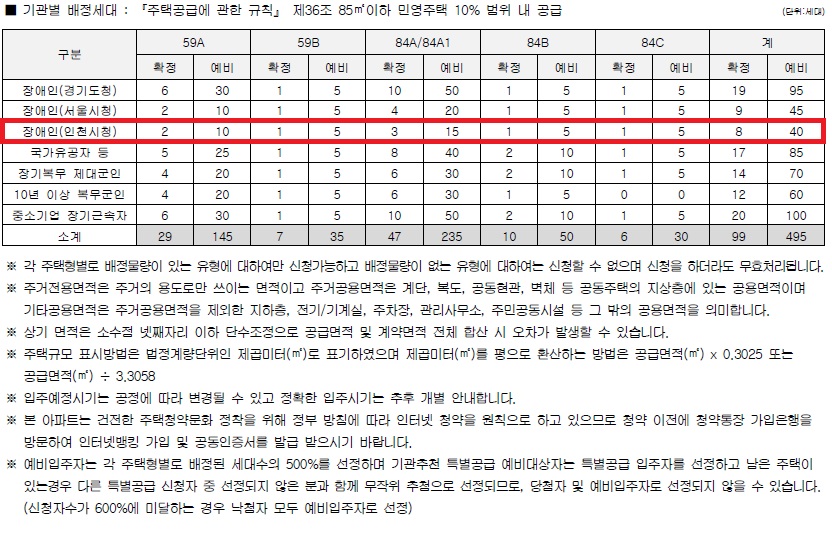 - 건설사의 사정으로 입주자 모집공고일이 최초 인천시 홈페이지에 안내한 입주자 모집공고(예정)일로부터 6개월 이상 연기될 경우 기존 접수 건에 대해서는 일괄 취소하고 기존 접수자를 포함하여 전면 재신청 실시함을 숙지하신 뒤 신청해 주시기 바랍니다.