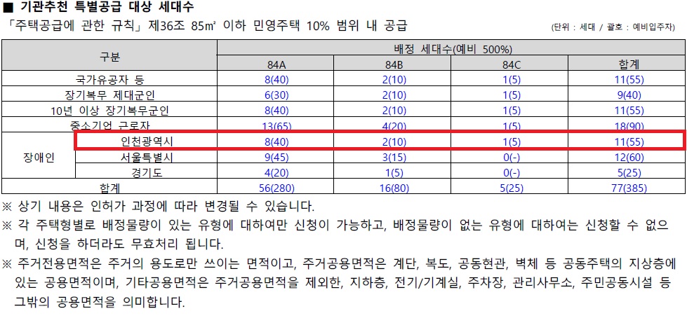 ※ 장애인 기관추천 특별공급 관련 개선사항(2022.1.3.시행) : 무주택 세대구성원 기간 및 인천시 연속 거주기간 등 자격요건 판단 기준일을