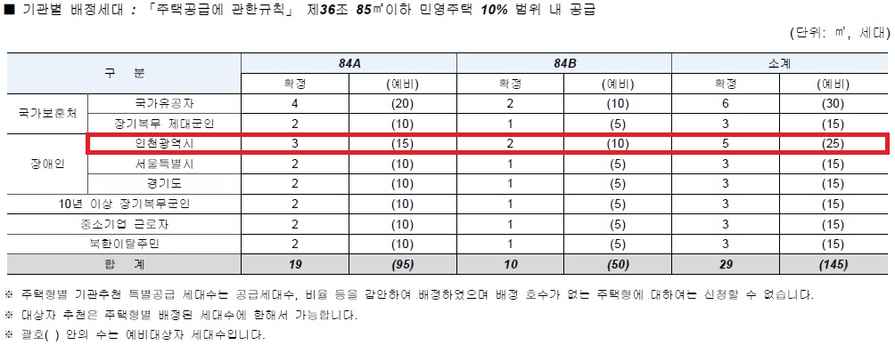 ※ 장애인 기관추천 특별공급 관련 개선사항(2022.1.3.시행) : 무주택 세대구성원 기간 및 인천시 연속 거주기간 등 자격요건 판단 기준일을