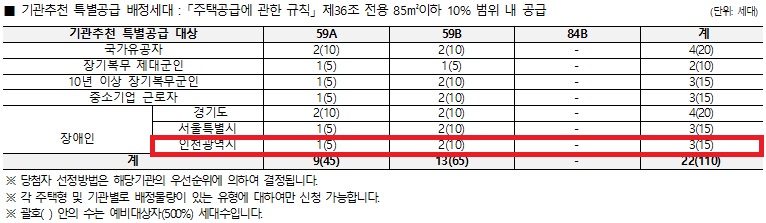 ※ 장애인 기관추천 특별공급 관련 개선사항(2022.1.3.시행) : 무주택 세대구성원 기간 및 인천시 연속 거주기간 등 자격요건 판단 기준일을