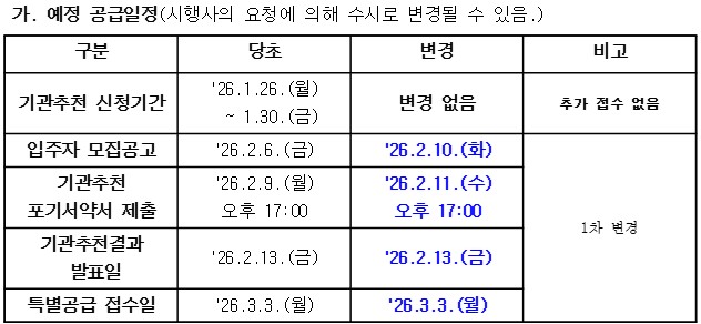 신청하신 분들께서는 추후 착오가 없도록 변경된 시행사의 기관추천 특별공급 안내문에서 공급 일정 등을