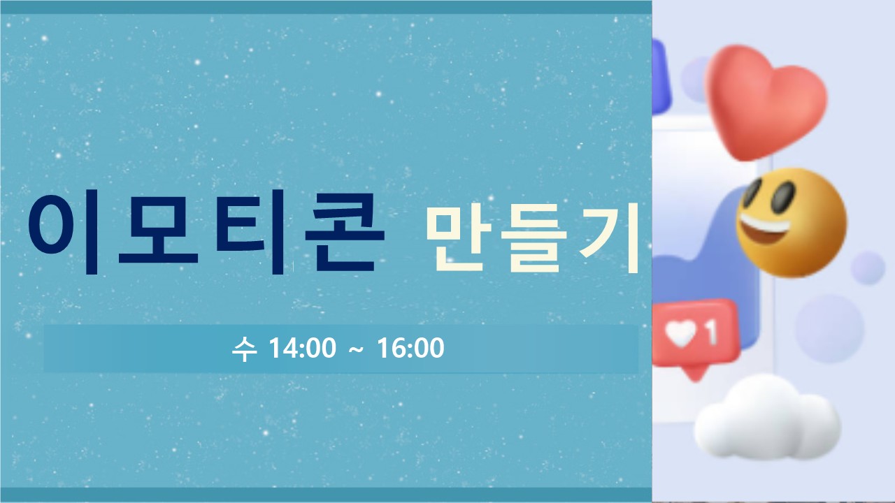 [단기] 취미가 돈이 되는 시대! 이모티콘 만들기 취미가 돈이 되는 시대! 이모티콘 만들기 강좌명 [단기] 취미가 돈이 되는 시대! 이모티콘 만들기 소개 포토샵과 온라인 그래픽 프로그램을 이용한 이모티콘, 스티커 제작을 배우고 카카오톡, 라인, 모히톡, 밴드, 네이버OGQ마켓 등의 이모티콘 플랫폼 비교, 분석하여 개성 있고 위트 있는 나만의 이모티콘, 스티커를 만들어보자 대상 이모티콘 제작을 배우고 싶은 인천시민(18세이상) 정원 15명 강사 윤수경 준비물 수강료 3만6천원 기간 수(주1회) 14:00~16:00 강의실 203호 교재비 재료비 1만4천원 차수별 강의내용 및 상세내용은 하단의 첨부파일 [강의계획서] 를 미리보기 해주세요
