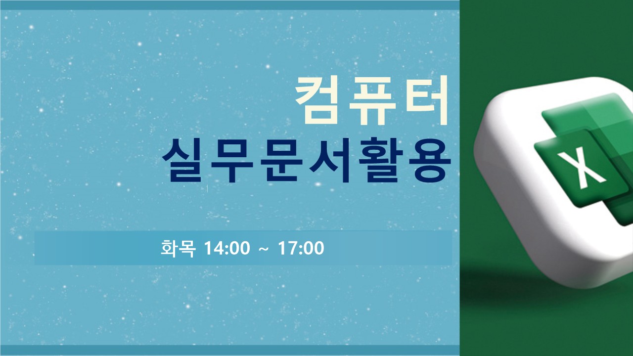 실습중심의 수업을 통해 실무에서 바로 사용 할 수 있는 엑셀 데이터관리와 한글을 학습하여 문서작성 및 관리능력을 향상시키고 실무에 필요한 다양한 문서작업을 효율적으로 수행할 수 있는 능력을 기른다 * 1기,3기 : 파워포인트실무, 엑셀실무 * 2기,4기 : 한글실무, 엑셀실무