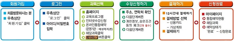 (장기간 미사용자는 로그인 후 반드시 "개인정보 수집이용 재동의" 를 해야 함) - 신청방법 : 인터넷 수강신청 (여성복지관 홈페이지 접속, 회원가입 후 인터넷 수강신청)